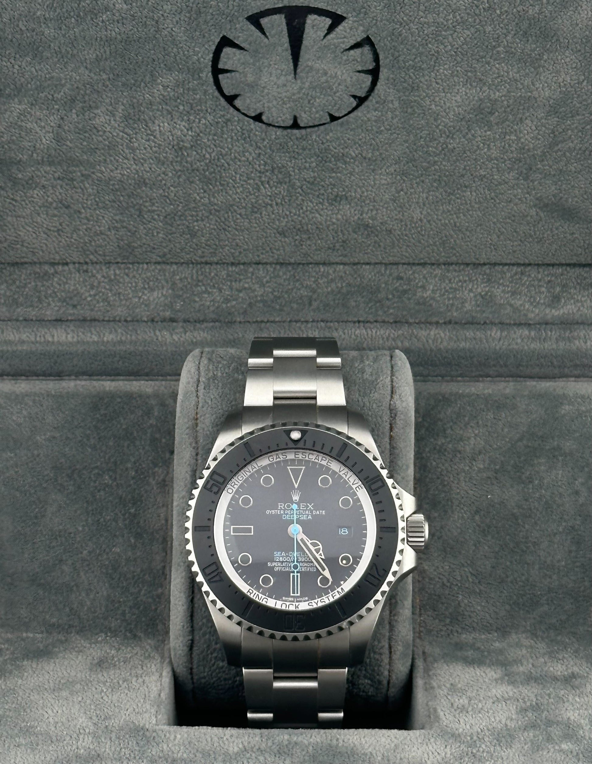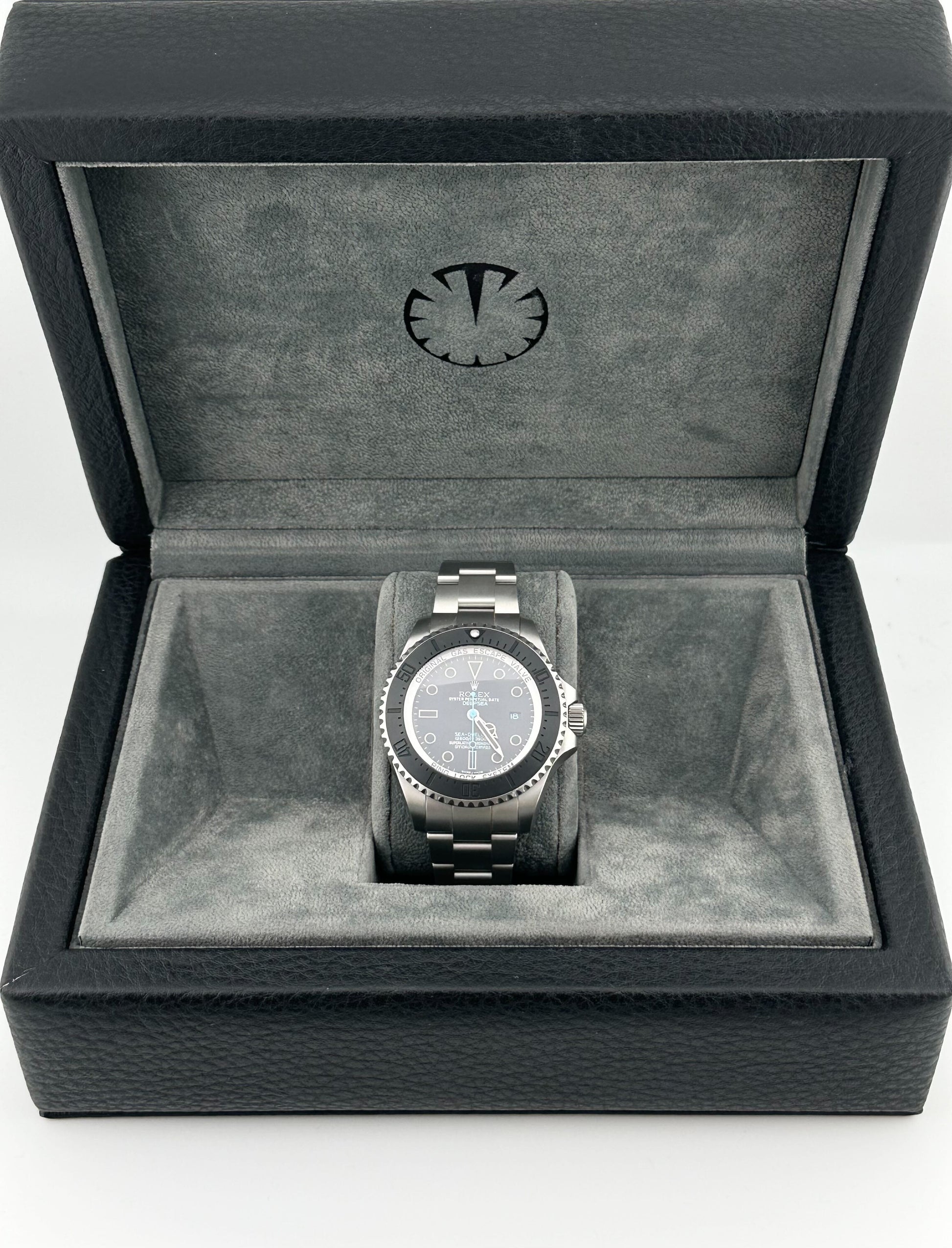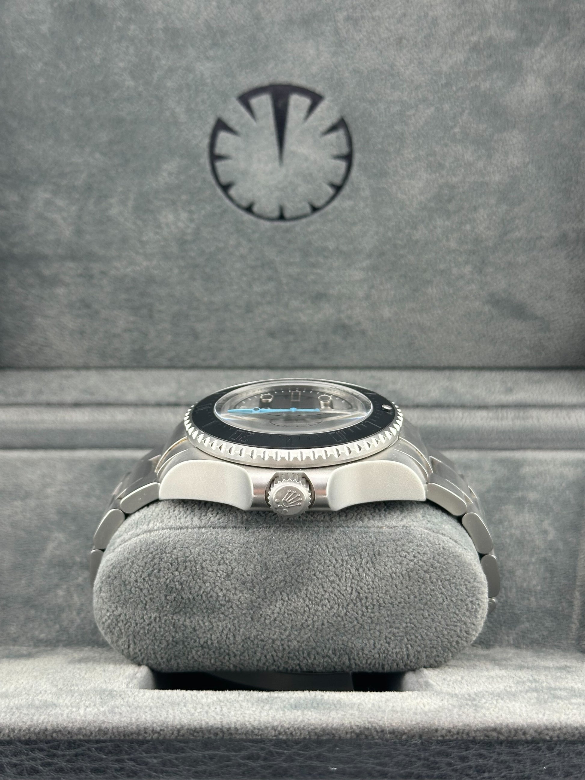 This special edition release model 2025 Watch Deepsea Sea-Dweller is crafted in an 44m stainless steel case. matte black bezel. and a black dial with blue hands. Chromalight?hour markers and hands?are with luminescent material for maximum timekeeping efficiency above and below the surface.