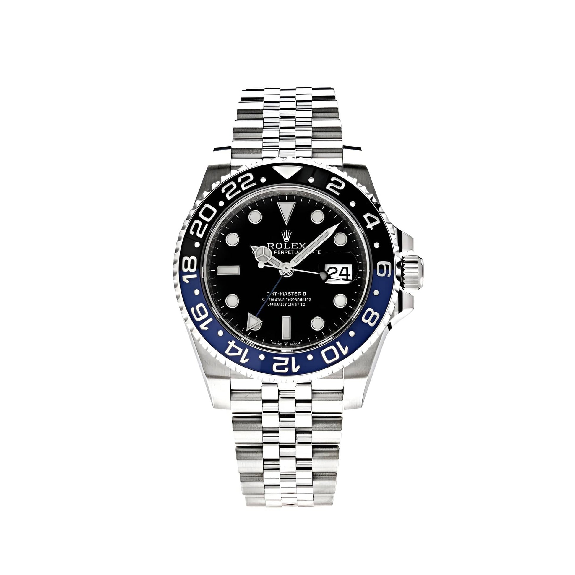 The 2025 Watch GMT-Master II 'Batgirl' features a 40mm stainless steel case with a black and blue 24hr Cerachrom on the bidirectional bezel. Its black dial and white luminous hour markers elevates this design. attracting a world of travelers. The 2025 Watch comes on a stainless steel Jubilee bracelet with a fold over clasp. a design that ensures a comfortable and secure fit on the wrist.?