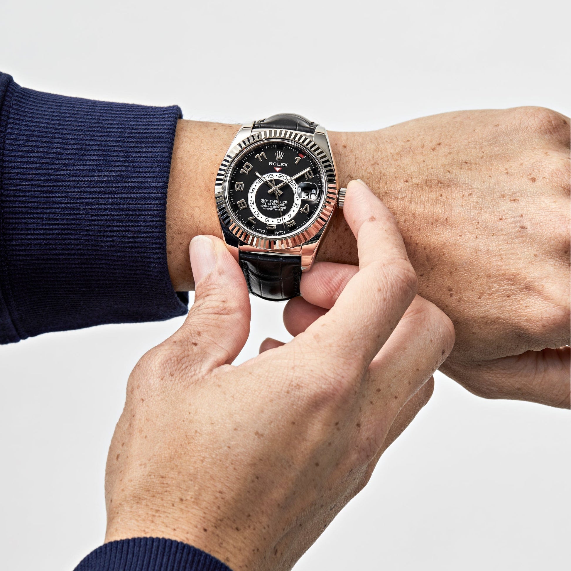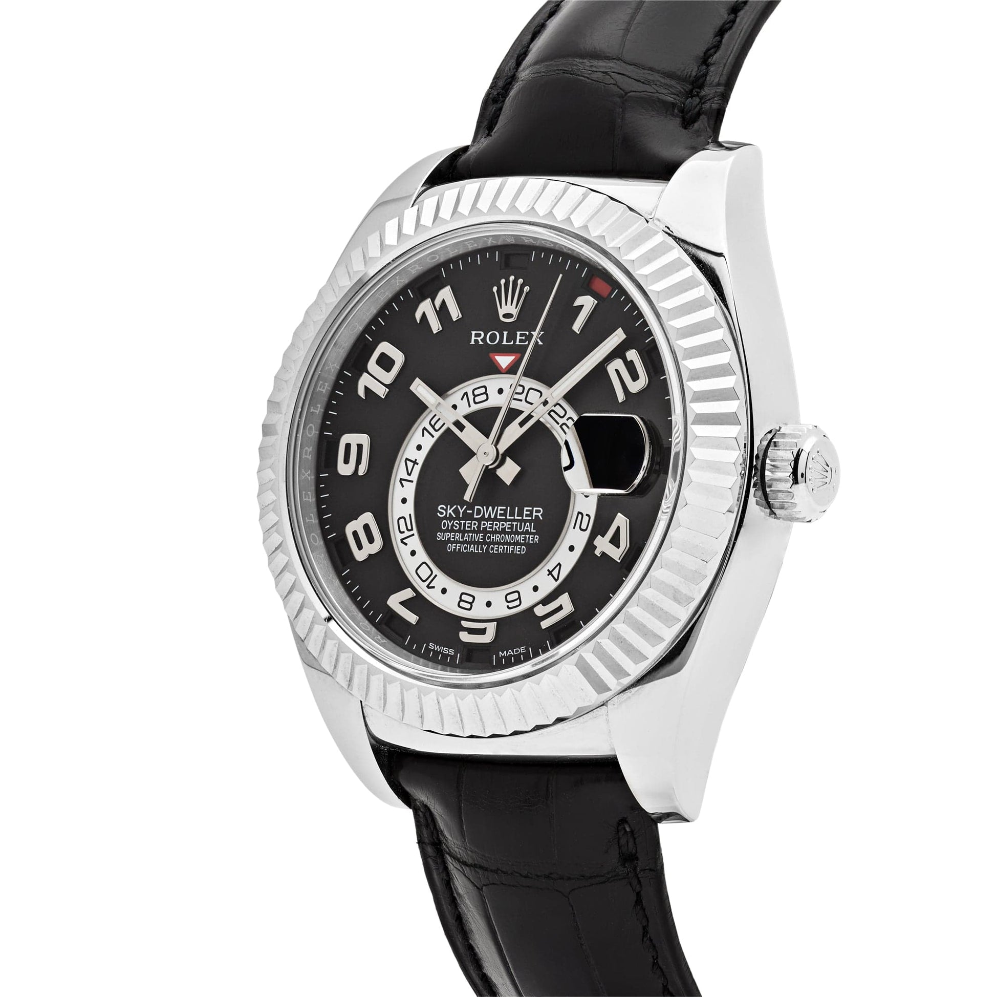 This 2025 Watch Sky-Dweller is inlaid in a 42mm 18k white gold case and fluted bezel. The Ring Command bezel can be rotated to select the date. the local time and the reference time. which can then be adjusted in either direction using the winding crown. The black dial features the date. local time. and the second time zone or reference time is displayed on a rotating 24-hour disc. This beauty is housed on a black alligator strap with oysterclasp to ensure style and comfort.