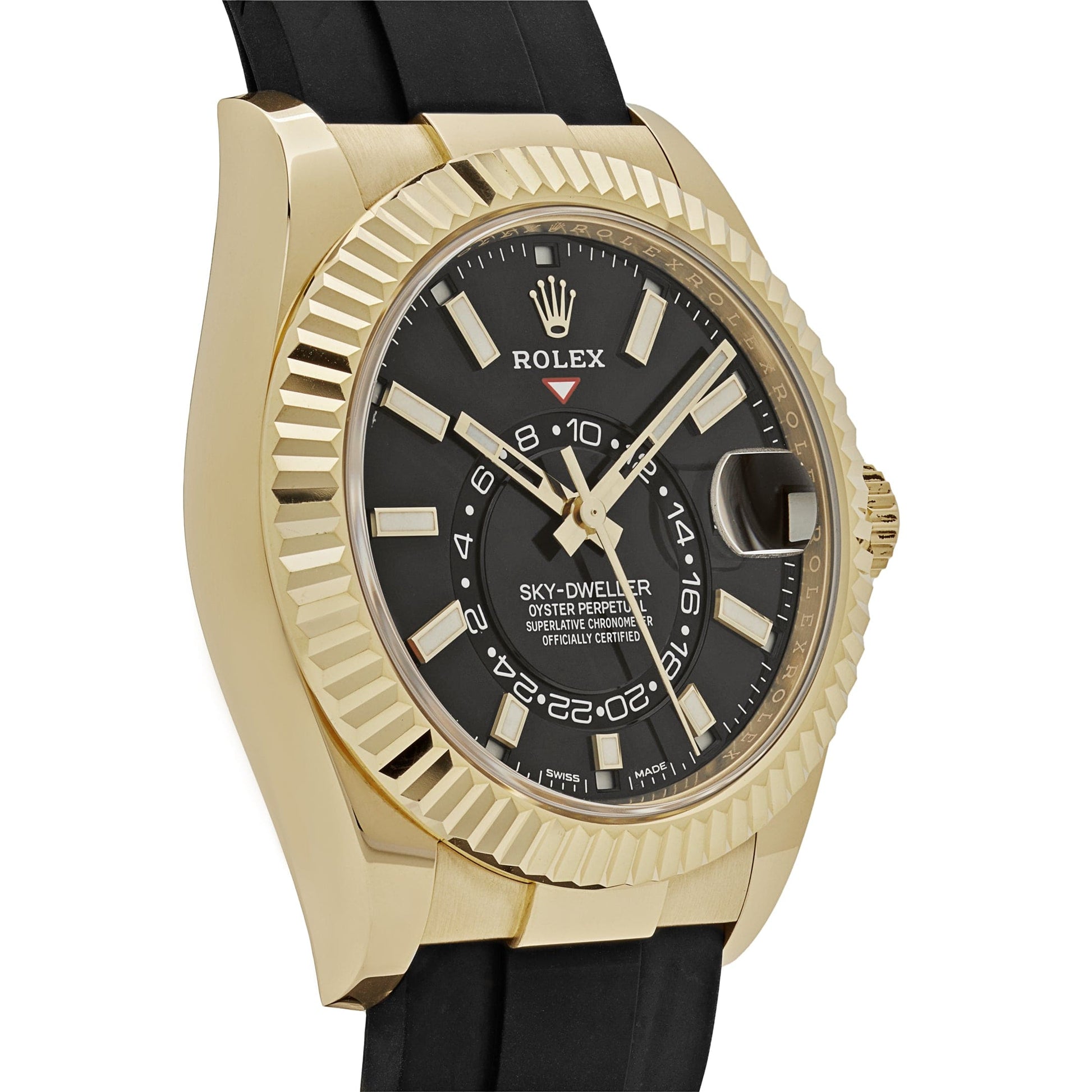 This 2025 Watch Sky-Dweller features dual time zones. inlaid in a 42mm 18k yellow gold case featuring a black dial with luminous hour markers and the signature yellow gold fluted bezel. The Ring Command bezel can be rotated to select the date. the local time and the reference time. which can then be adjusted in either direction using the winding crown. The Oysterflex bracelet combines the specialties of a metal bracelet and high performance elastomer with oysterclasp to ensure flexibility and comfort.?