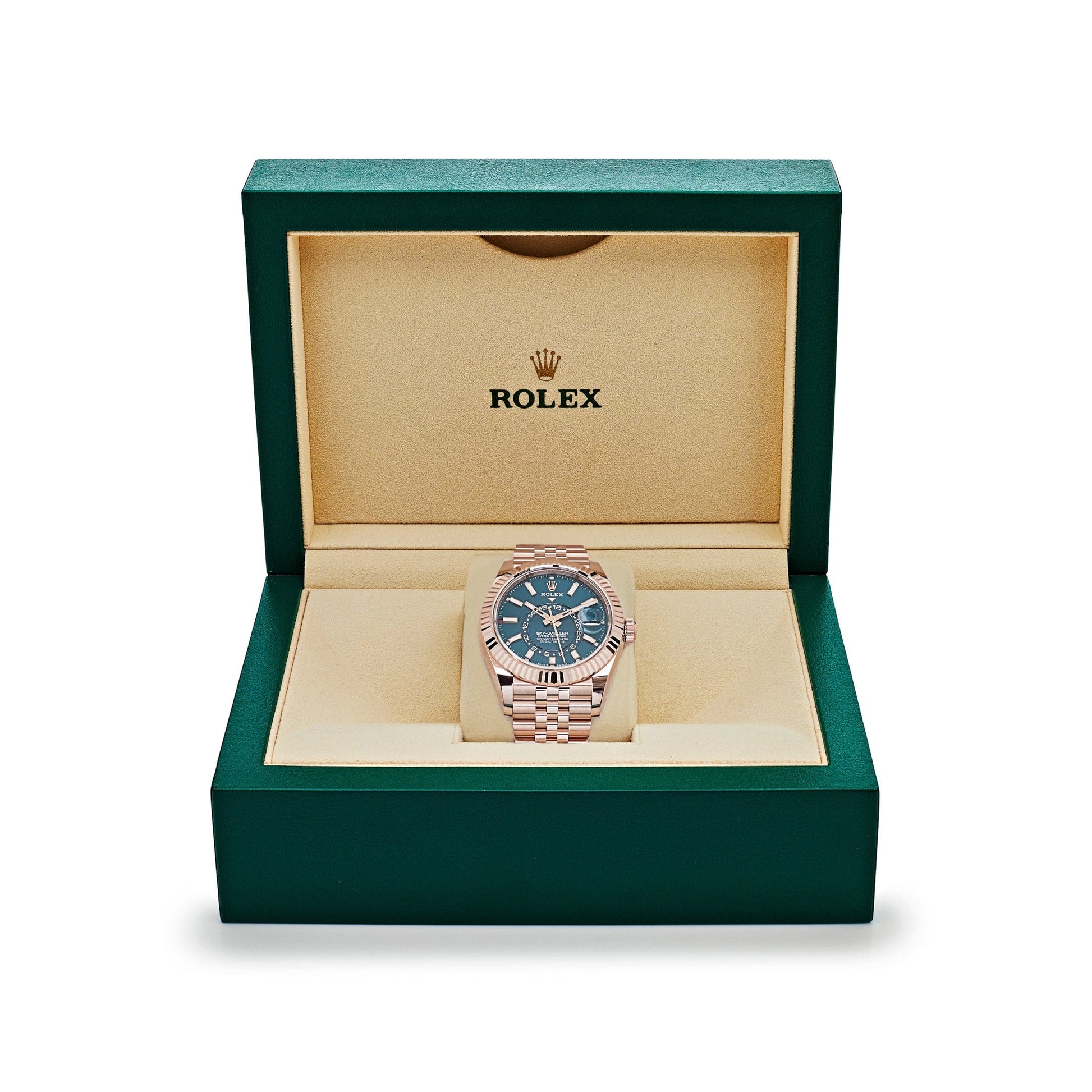 The 2025 Watch Sky-Dweller 336935 ?is a marvel of both design and function. featuring a 42 mm case with a monobloc middle case. screw-down case back. and winding crown. The scratch-resistant sapphire crystal with a Cyclops lens over the date ensures readability. while the screw-down Twinlock winding crown provides water resistance up to 100 meters (330 feet). The 2025 Watch is paired with an 18kt Everose gold Jubilee bracelet. combining and comfort.