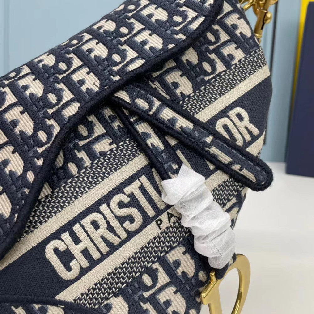 - The iconic saddle bag. Fully embroidered with the house's signature logo, this style features a "saddle" flap with a magnetic "D" closure in the shape of a saddle and antiqued gold accents on either side of the handle. The metal "CD" logo complements the legendary logo in style. Wear it as a tote or shoulder bag, or customize it with the optional shoulder strap.